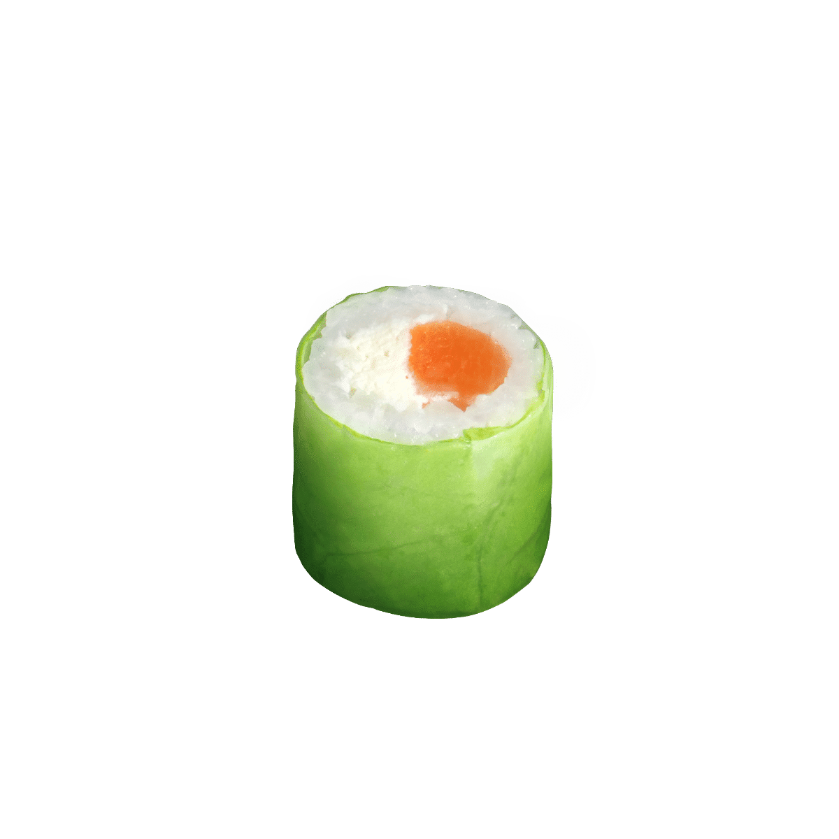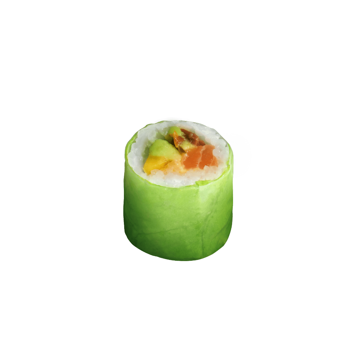 Riz vinaigré, feuille d’algue nori, beignet de crevette, concombre, oignons frits, sauce samouraï